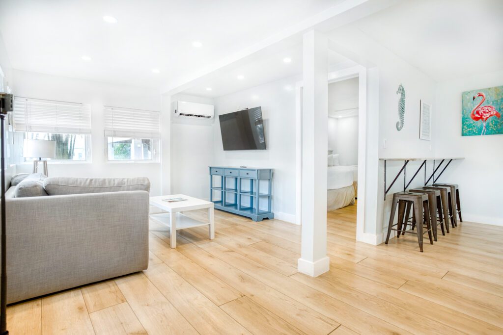 Featuring a wide view open concept with living room, bar wall dining area, and wet bar with full size refrigerator, this two bedroom is uniquely situated at the corner of 3rd and 5th street at the north edge of our retreat and close to the new resort pool.