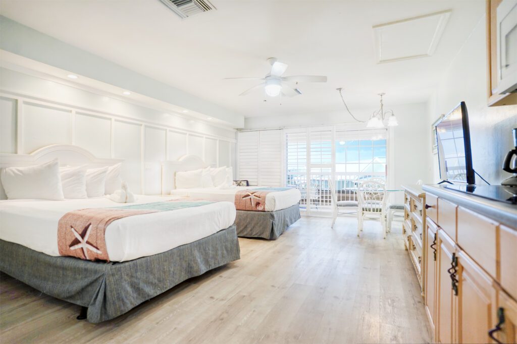 Sleeping up to 4 guests, this Two Queen bed studio suite features a fully equipped kitchen, dining area, large bathroom and plenty of room to relax at the end of a great beach filled day.
